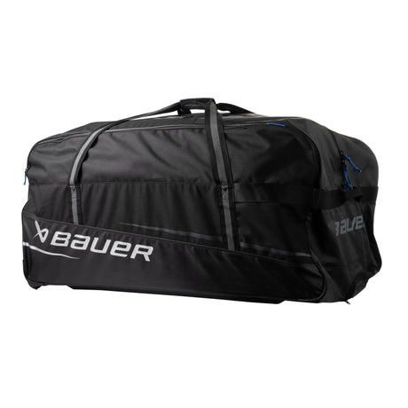 The Bauer Premium Goalie Wheeled Bag (2024) is crafted from durable reversed 600D Poly and 5mm RIPSTOP materials, providing rugged reliability for goaltenders on the go. Featuring a large main compartment with a straight zipper, two separate end pockets, an external water bottle pocket, and premium dual-sided ventilation panels, this bag ensures organized storage and optimal breathability.