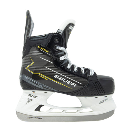 The 2024 Bauer Supreme Matrix Junior Hockey Skates are engineered with 1-Piece Hydrophobic Liner and a 40 OZ Pro Stock Felt tongue, that provide exceptional moisture management and durability, while the TUUK Lightspeed Edge blade holder and Pulse SS runner offer precise control and acceleration.