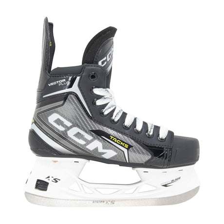 Experience unmatched comfort and performance with the Source Exclusive CCM Tacks Vector Plus Hockey Skates. Built with a 2D quarter faux carbon skin, these skates offer a blend of durability and style. The dual-layer 7mm felt tongue and same material liner with ankle pad reduce liner foam for a snug fit. Featuring a plastic XS pin holder and CCM XS runner, along with vinyl facings and aluminum eyelets, these skates are designed for optimal control and agility on the ice.